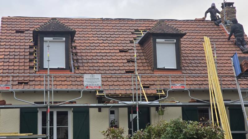 Dépose de l'ancienne couverture : retrait des anciennes tuiles et vérification de l'état de la charpente.